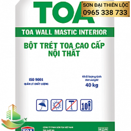 Bột trét TOA Wall Mastic interior là bột trét (bột bả) tường nội thất dùng cho các bề mặt như: tường xi măng, trần nhà, bê tông và các bề mặt cần xử lý trước khi sơn lót hoặc sơn phủ. Thích hợp cho mọi loại sơn nước ngoại thất. Không bong tróc, nứt nẻ. Bền vững với thời gian, chịu đựng mọi thời tiết.